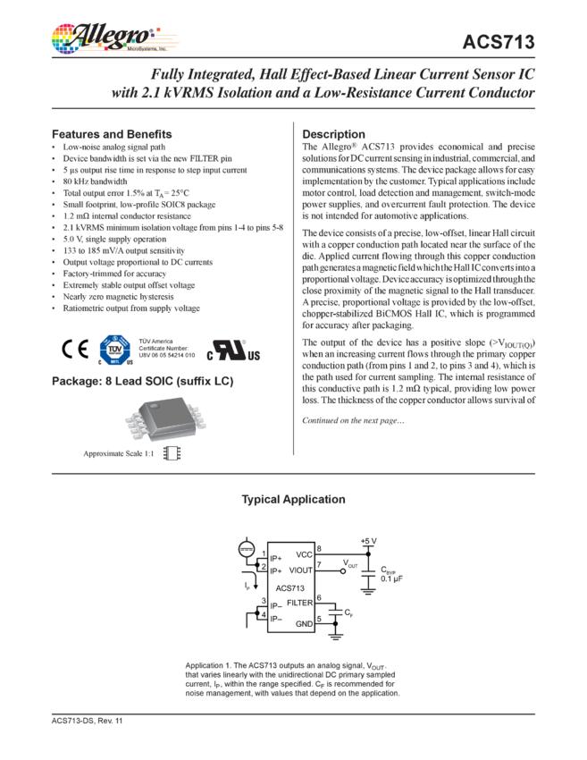 Czujnik prądu w postaci układu scalonego, jednokierunkowy, Vcc = 5 V, zakres pomiarowy 20 A, Vrms = 2100 V, pasmo wyjściowe 80 kHz, zakresy temperaturowe: E