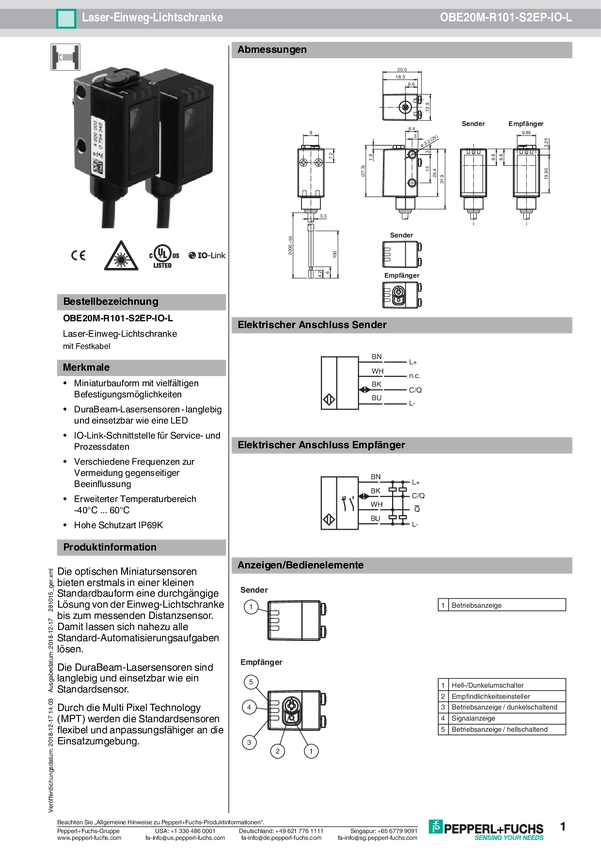 Fotokomórka jednokierunkowa laserowa Pepperl+Fuchs OBE20M-R101-S2EP-IO-L 281015 Przełącznik (Jasność / Ciemność) 1 szt.