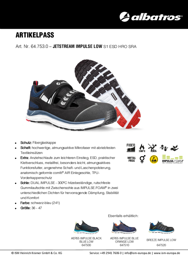 Albatros JETSTREAM IMPULSE LOW S1 ESD HRO SRA 647530241000047 Obuwie ochronne S1 Rozmiar buta (EU): 47 czarno-niebieski