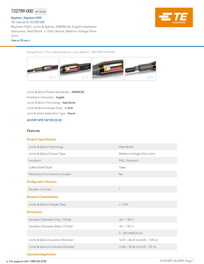 TE Connectivity TE TEE Heatshrink Medium Voltage Joints 722789-000, 1 szt.