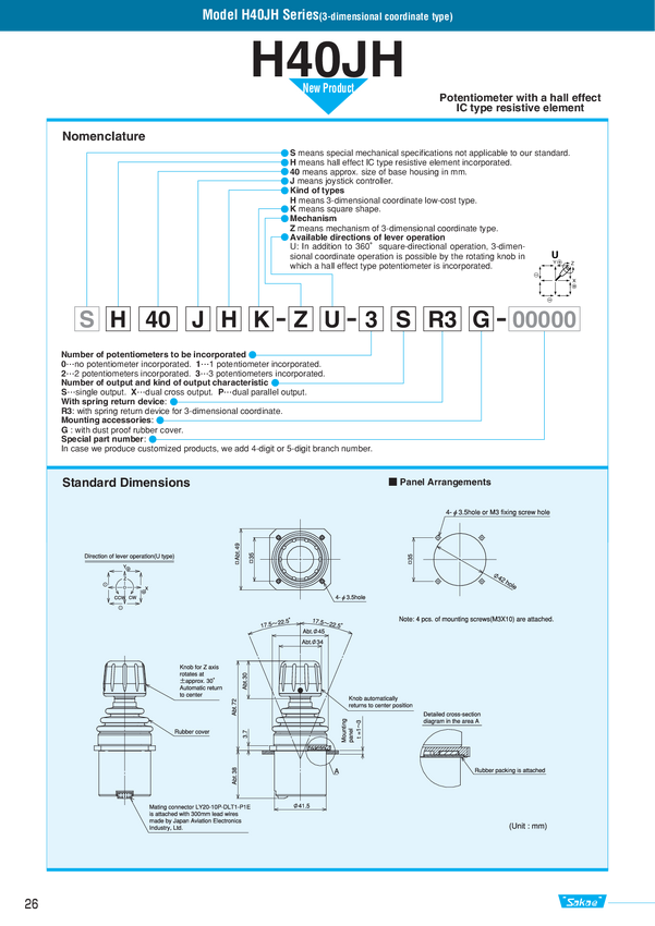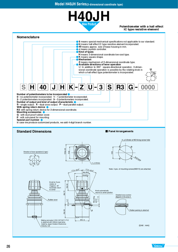 Joystick na bazie potencjometrów typ hall effect; wersja 2 osiowa Joystick na bazie potencjometrów typu hall effect Napięcie wyjściowe 0.5-4,5 V 10-90% przy zasilaniu Vcc = 5V DC Średnica otworu montażowego 42mm; średnica 42/49mm gł.38mm+ rękojeść z mieszkiem 72 mm 3 kierunkowy X i Y +-17,5-22,5 st ; Z +- 27,5 st Joystick based on hall effect potentiometers; Output voltage 0,5V-4,5V = output 10-90% at power supply 5V DC Its possible to deliver special version 0-5V output 0-100% on special order ( SH40JHK-