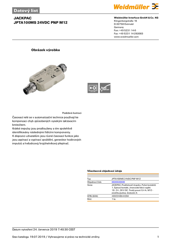 Weidmüller 8836630000 Rozdzielacz i adapter czujnika/aktuatora JPTA100MS 24VDC PNP M12, 1 szt.