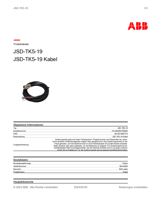 ABB 2TLA930057R0000 Kabel połączeniowy czujnika/aktuatora JSD-TK5-19, 5 m, 1 szt.