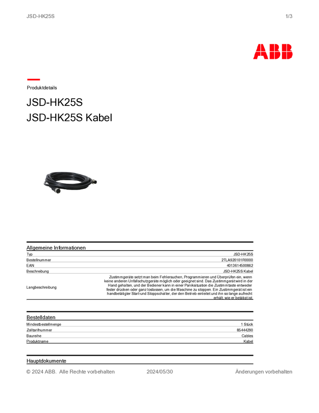ABB 2TLA920101R0000 Kabel połączeniowy czujnika/aktuatora JSD-HK25S, 1 szt.