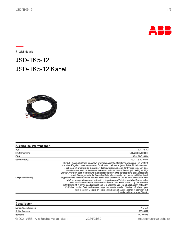 ABB 2TLA930050R0000 Kabel połączeniowy czujnika/aktuatora JSD-TK5-12, 5 m, 1 szt.