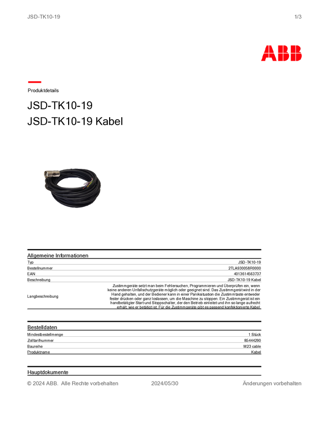 ABB 2TLA930058R0000 Kabel połączeniowy czujnika/aktuatora JSD-TK10-19, 10 m, 1 szt.
