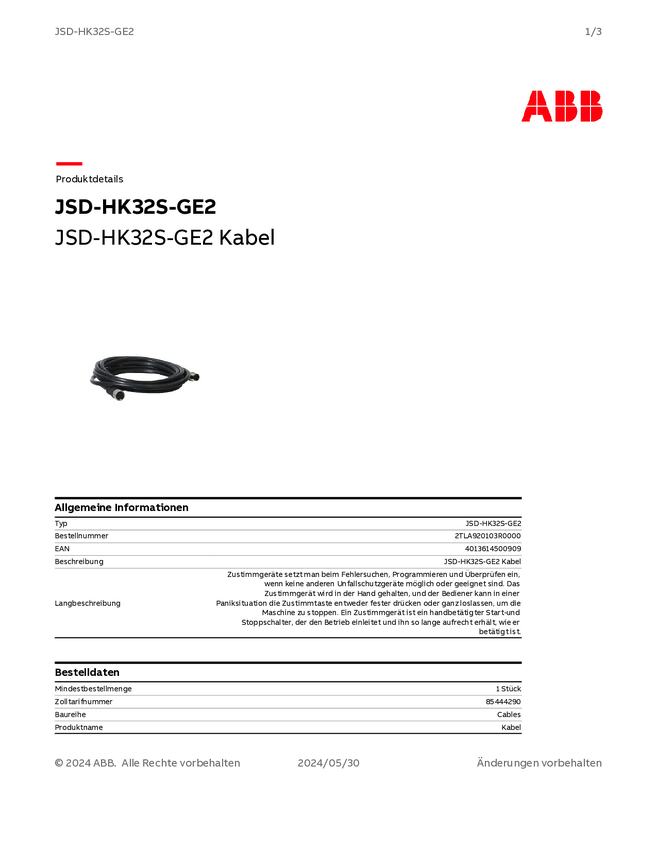 ABB 2TLA920103R0000 Kabel połączeniowy czujnika/aktuatora JSD-HK32S-GE2, 1 szt.
