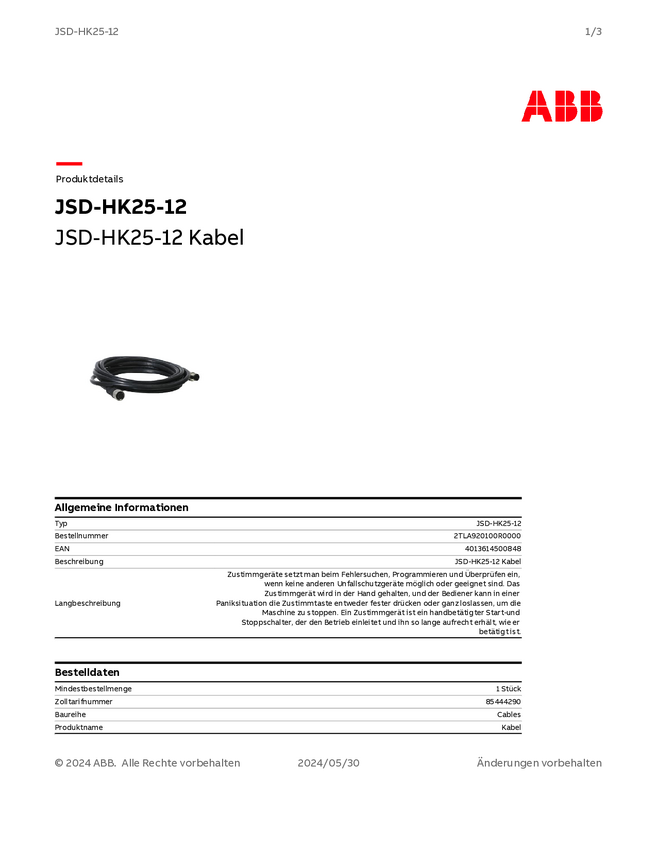 ABB 2TLA920100R0000 Kabel połączeniowy czujnika/aktuatora JSD-HK25-12, 1 szt.