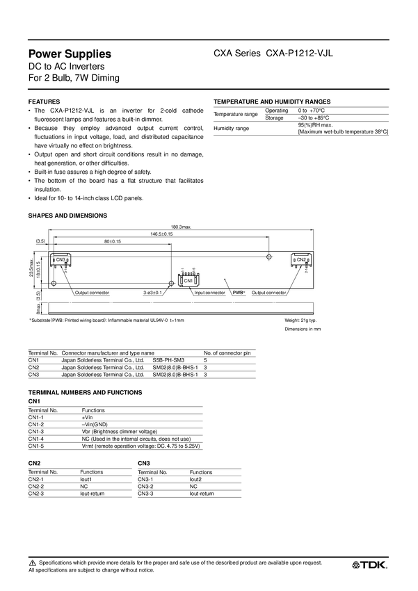 Przetwornica DC/AC- Inverter dla 1 lampy; 45 khz, 7 pin Dimming/connector type' V in 24 V (+-4V) DC; V-out 1500 V AC Wymiary: 95,5x10x8mm; otwory rozstaw 82/12,8mm Pasujące złącza do Vin CN1 - Molex 51021-500 do Vout CN2 - JST BHR-03VS1 dla wersji VJL JST BHSR-02VS-1 dla wersji VSL