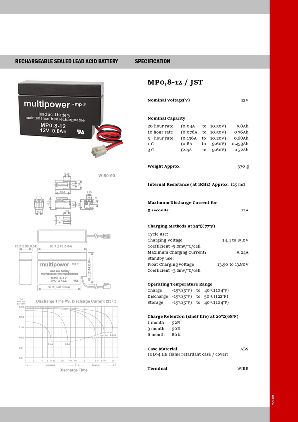 Akumulator ołowiowy multipower PB-12-0,8-JST MP0,8-12, AGM, 12 V, 0.8 Ah