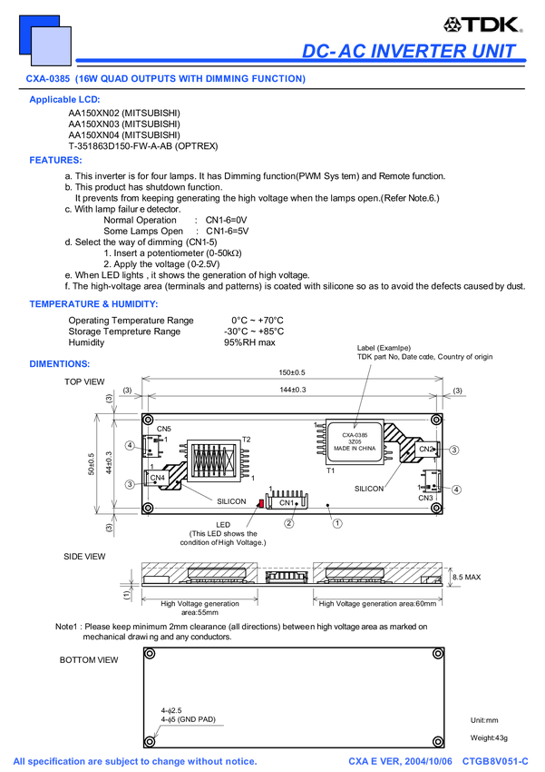 Input Voltage 10.8-13.2 V DC; putput Voltage 1700 V; 4 lampy Output Current 6,5-3mA; ALarm Signal; Shat Down; Remote; Przetwornica dedykowana do AA150xc01 następca ze składu Input Fuse; SMB02B-BHSS-1-RB SM02(4) B-BHS-1-TB JST Przetwornica dedykowana do: AA150XN2,3,4 Mitsubishi T-351863D150-FW-A-AB Optrex i innych o zasilaniu 12 V DC i na 4 od dziene lampy