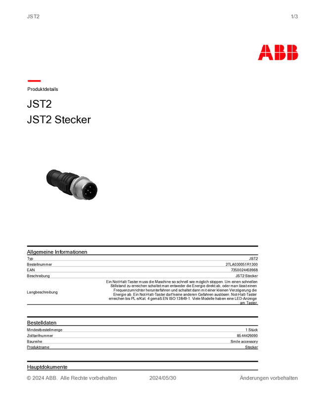 ABB 2TLA030051R1300 Złącze czujnika/aktuatora JST2, 1 szt.
