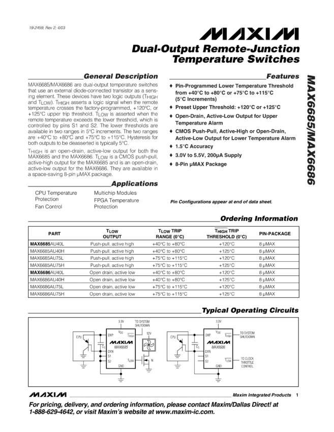 MAX6685, MAX6686 Dual-Output Remote-Junction Temperature Switches