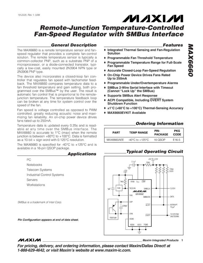 MAX6660 Remote-Junction Temperature-Controlled Fan-Speed Regulator with SMBus Interface
