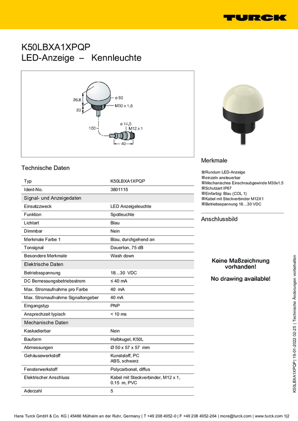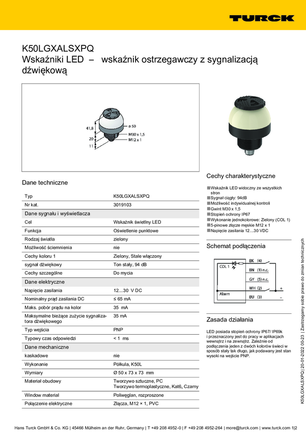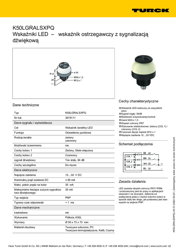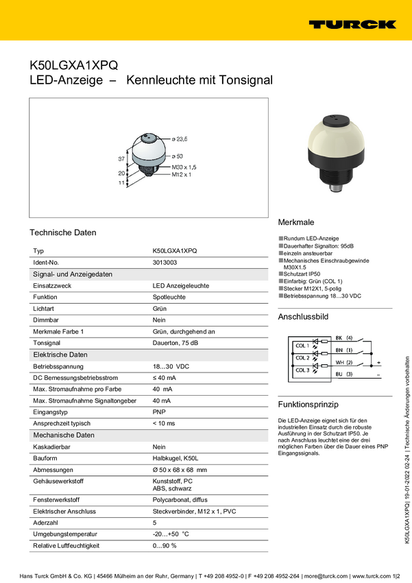 Lampa okrągła Turck K50LGXASXPQ dźwięk ciągły, światło ciągłe 65 dB