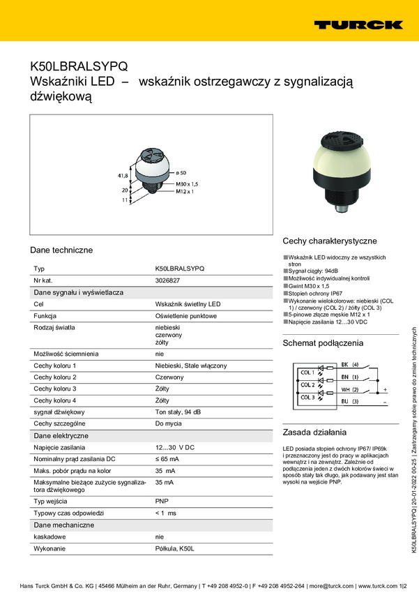 Lampa okrągła Turck K50LBRALSYPQ dźwięk ciągły, światło ciągłe 94 dB