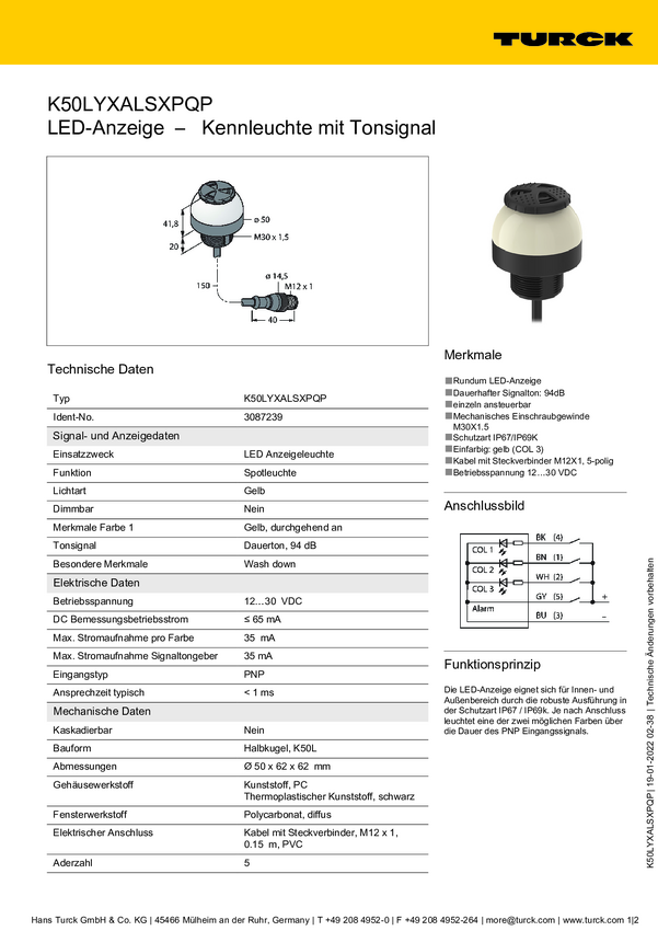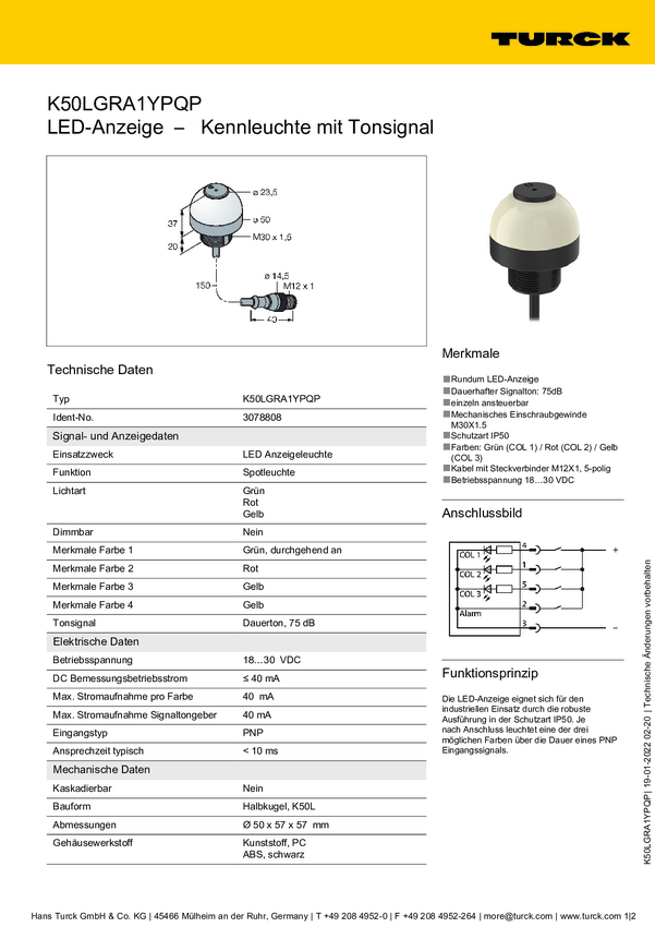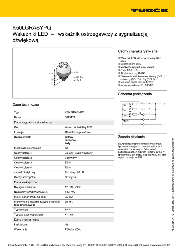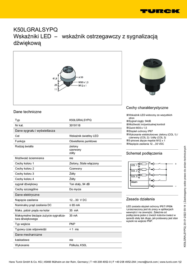 Lampa okrągła Turck K50LGRASYPQ dźwięk ciągły, światło ciągłe 65 dB