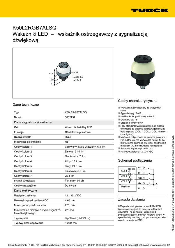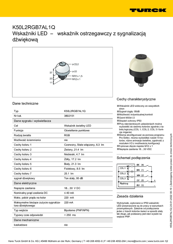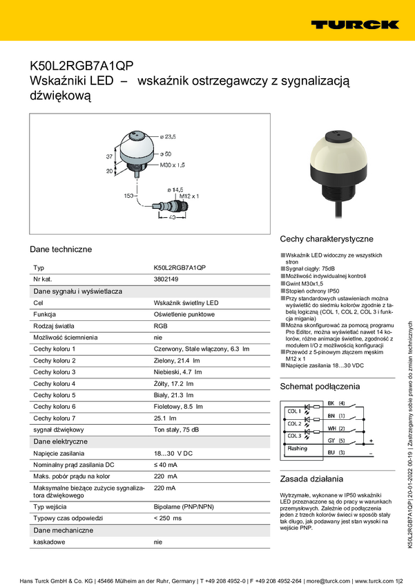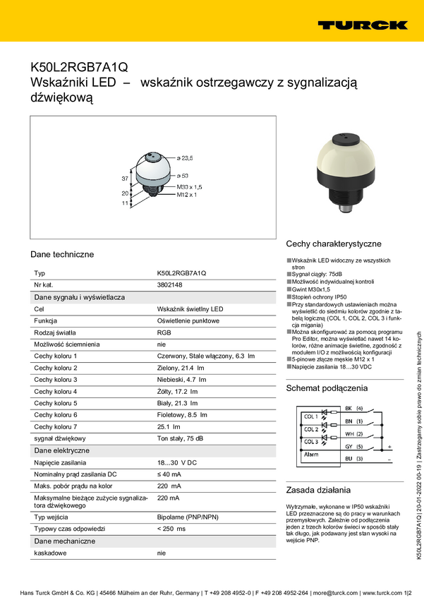 Lampa okrągła Turck K50L2RGB7AL1Q dźwięk ciągły, światło ciągłe 95 dB