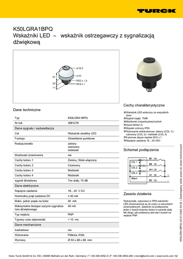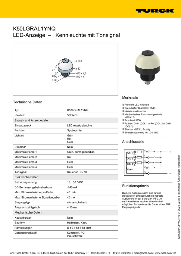 Lampa okrągła Turck K50LGRAL1YNQ dźwięk ciągły, światło ciągłe 95 dB