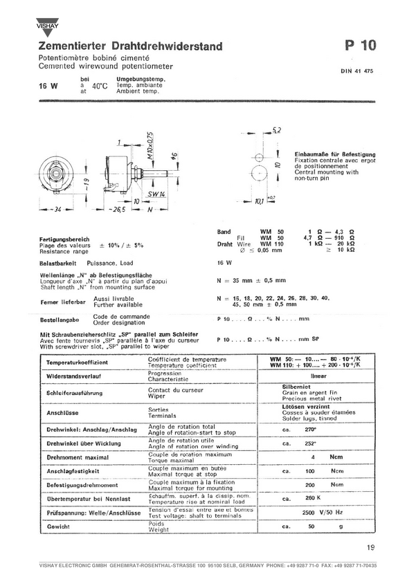 Potencjometr liniowy 27 ohm; 16W ( 10W ) średnica 34 mm; gł. 26,5mm; ośka 6mm długość 35 mm łącznie z gwintem M10x0,75 dł. 10mm Diameter 34mm deep 26,5mm; Metal Shaft 6,00 mm / 35 mm long Bushing M10 x 0,75 / 10 mm long Anti rotation lug P10 50 27R 10% BXB VISHAY