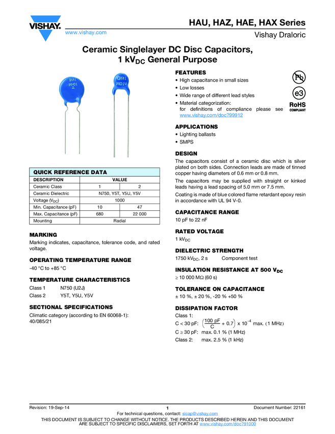 Cap Ceramic 220pF 1000V K2000 10% (7 X 3mm) Radial 5mm 85°C Bulk