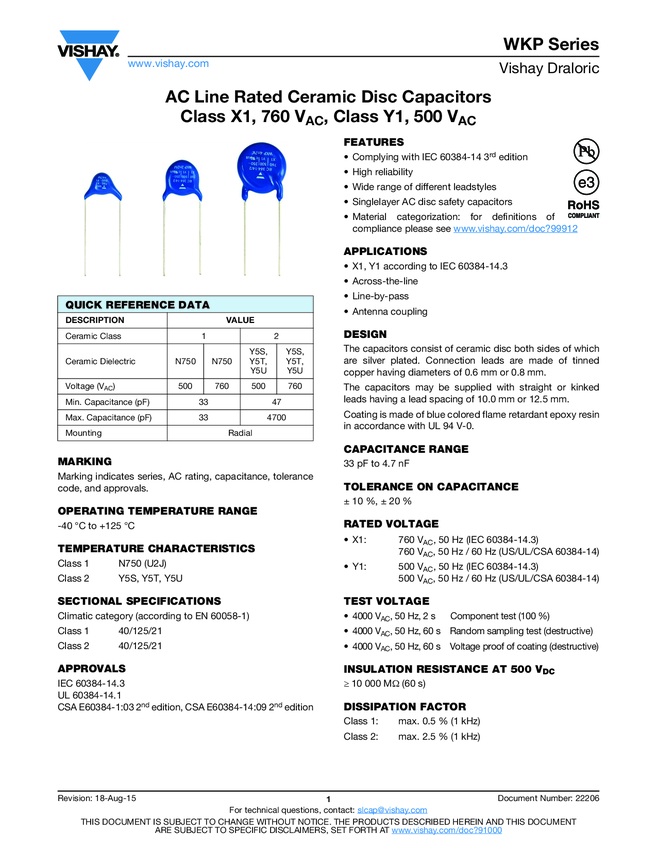 Cap Ceramic 220pF 760VAC/500VAC K2000 20% (8 X 6mm) Radial 12.5mm Bulk