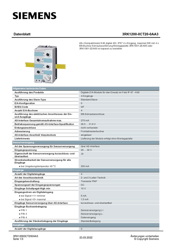 Kompaktowy moduł AS-I K45, IP67, cyfrowy, 4x1 wej., maks. 200mA, PNP, 4xM8 gniazdo