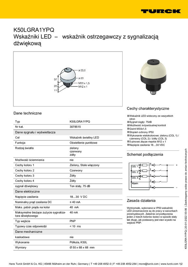 Lampa okrągła Turck K50LGRA1YPQP dźwięk ciągły, światło ciągłe 75 dB