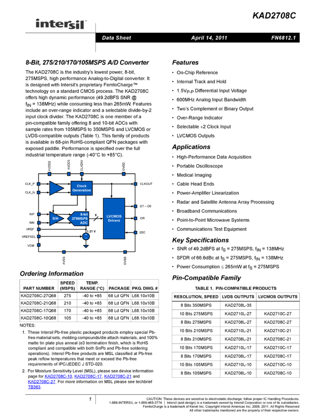 10-Bit, 105MSPS Single-Channel ADC, LVDS Outputs