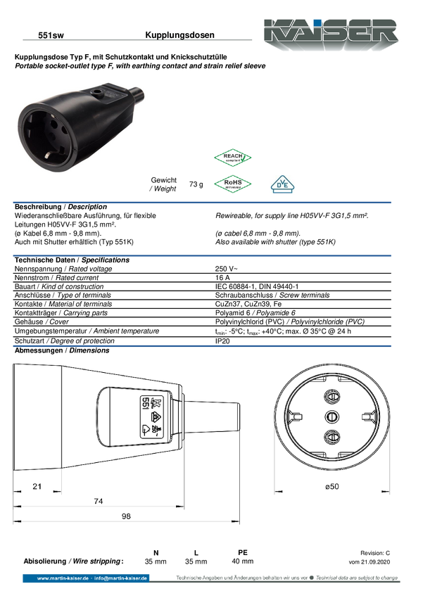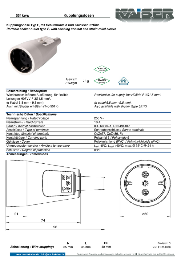 Złącze z uziemieniem Martin Kaiser 551/kws, IP20