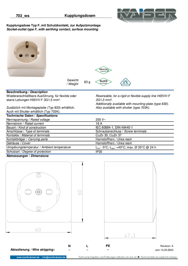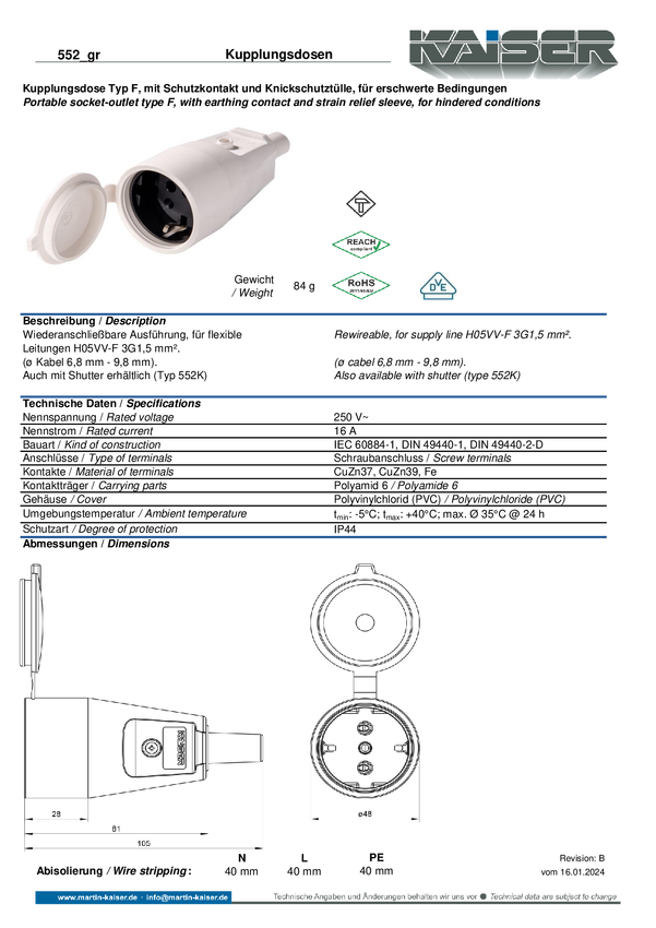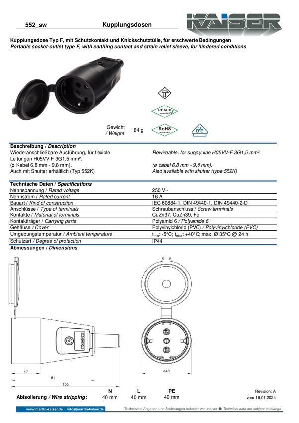 Złącze z uziemieniem Martin Kaiser 552/kws, IP44