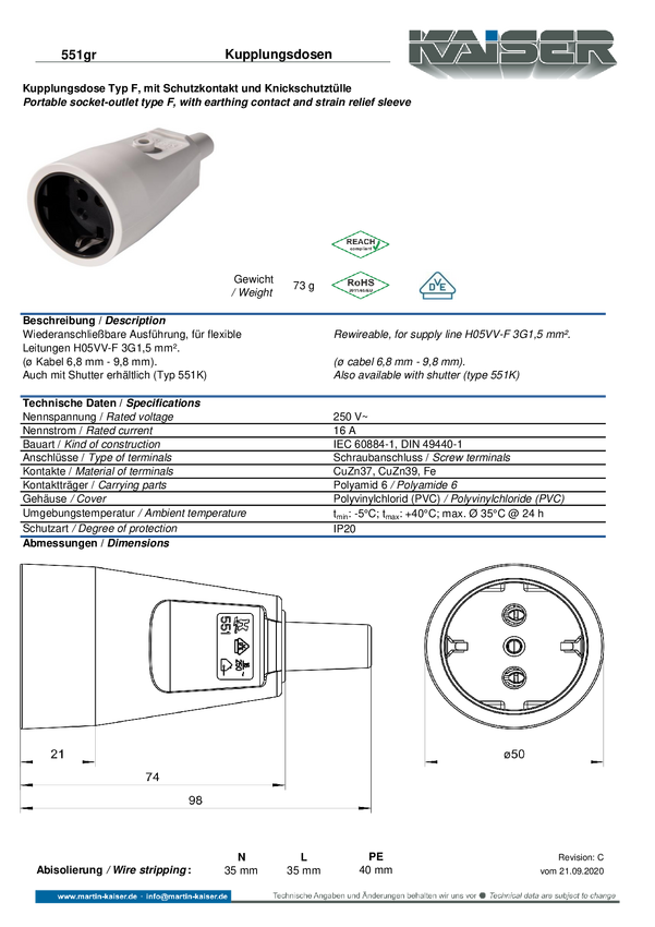 Złącze z uziemieniem Martin Kaiser 552/gr, IP44