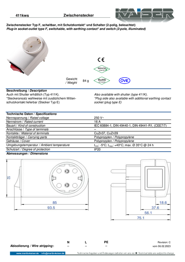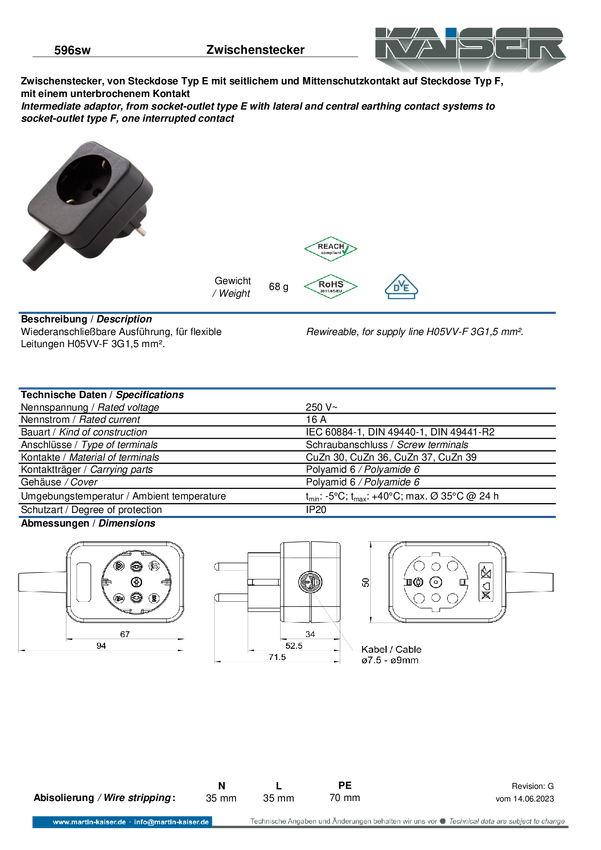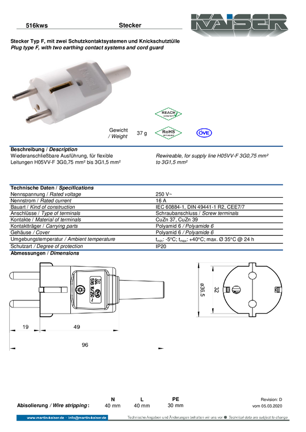 Wtyczka z uziemieniem Martin Kaiser 516/kws, IP20