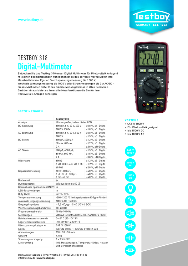 Multimetr cyfrowy Testboy TB 318-ISO 61414000, CAT IV 1000 V, AC/DC, kalibracja ISO