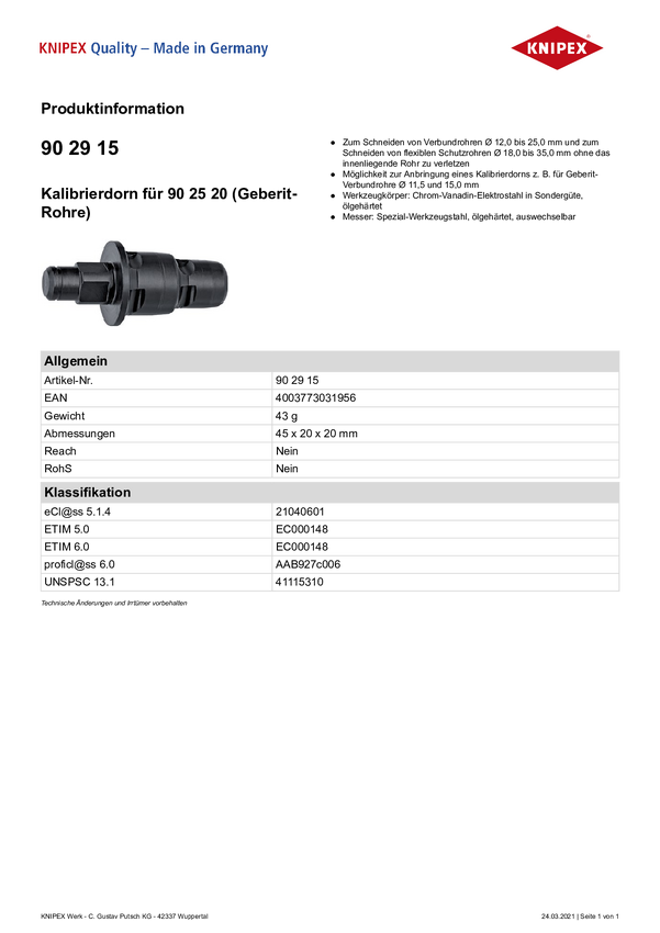 Trzpień kalibracyjny Knipex 90 29 15 45 mm 1 szt.