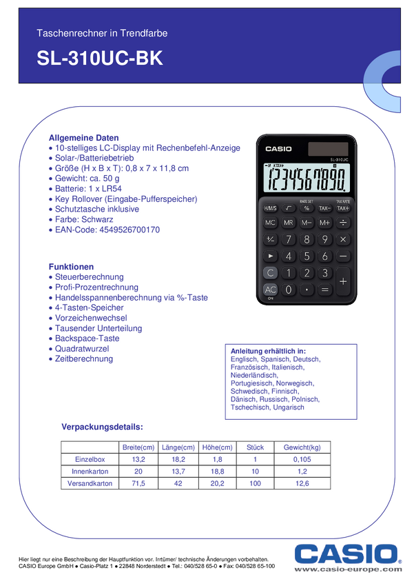 Casio SL-310UC-BK Kalkulator kieszonkowy czarny Wyświetlacz: 10 energią słoneczną, bateryjne (S x W x G) 70 x 8 x 118 mm