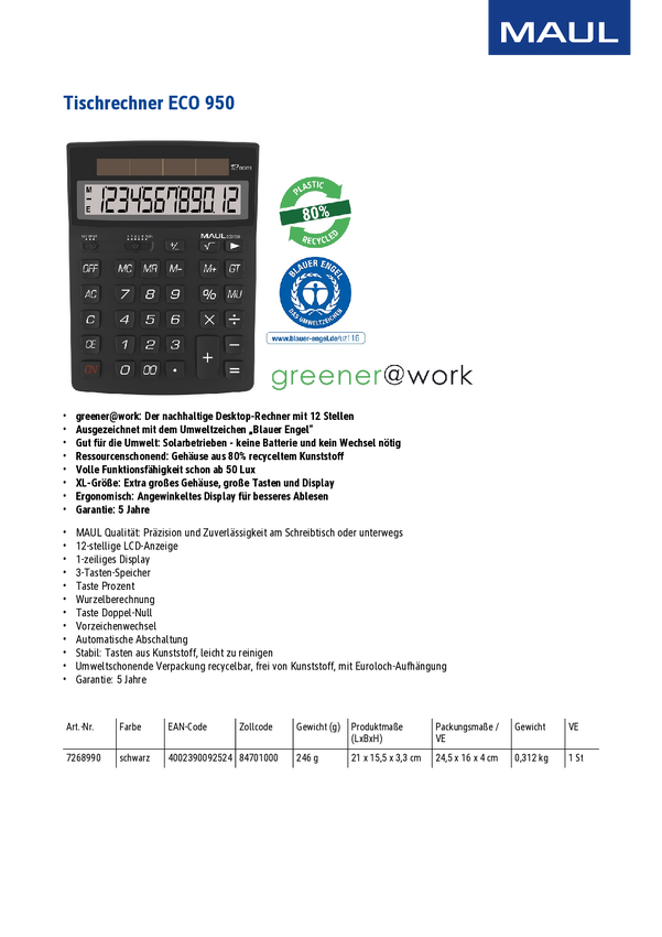 Maul ECO 950 Kalkulator stołowy czarny Wyświetlacz: 12 energią słoneczną (S x W x G) 155 x 210 x 33 mm