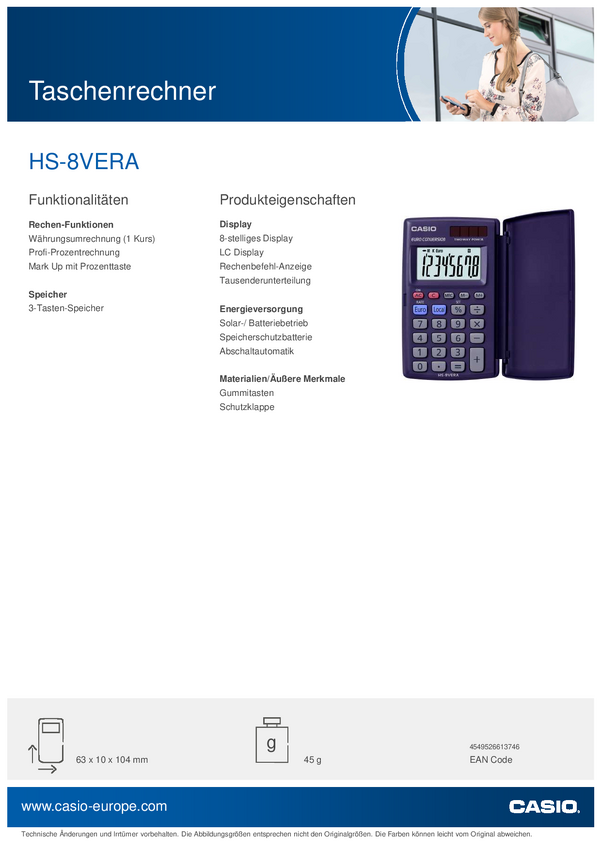 Casio HS-8VERA Kalkulator kieszonkowy granatowy Wyświetlacz: 8 energią słoneczną, bateryjne (S x W x G) 62.5 x 10 x 104
