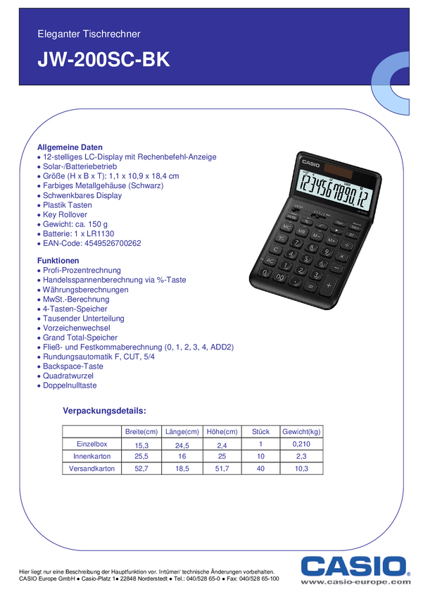 Casio JW-200SC-BK Kalkulator stołowy czarny Wyświetlacz: 12 energią słoneczną, bateryjne (S x W x G) 109 x 11 x 184 mm