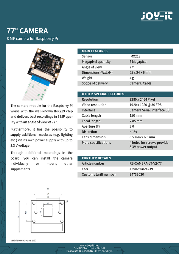 Moduł kamery kolorowej CMOS Joy-it rb-camera_JT-V2-77 rb-camera_JT-V2-77 Pasuje do: Raspberry Pi®