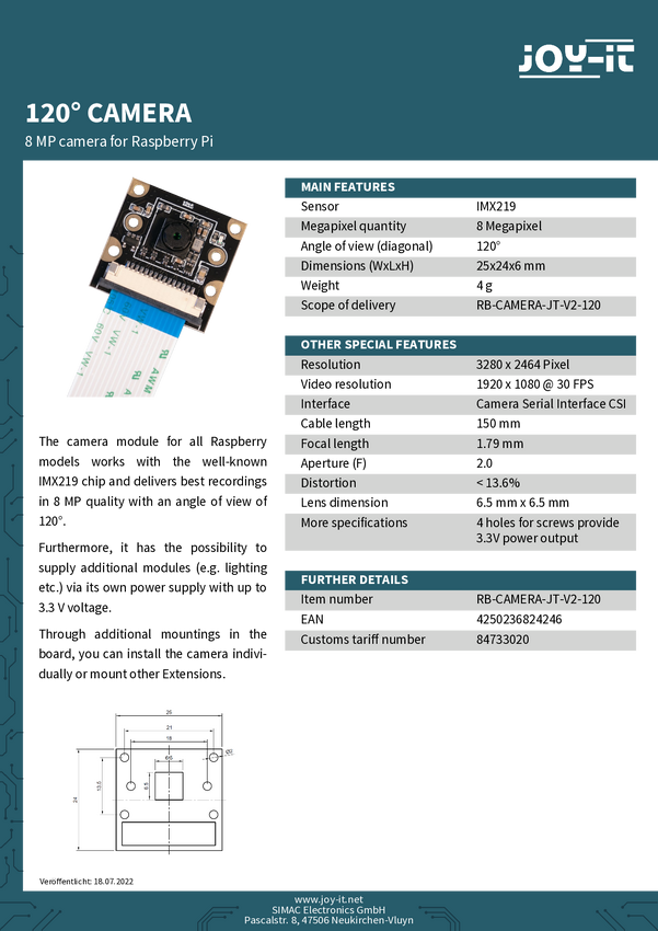 Moduł kamery kolorowej CMOS Joy-it RB-CAMERA-JT-V2-120 Joy-IT Pasuje do: Raspberry Pi®