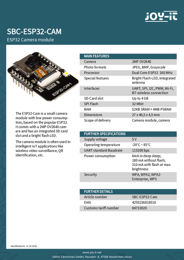 Moduł kamery Joy-it SBC-ESP32-Cam 1 szt.