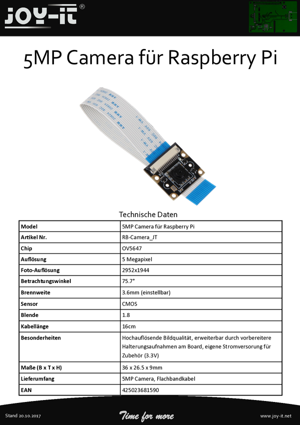 Moduł kamery kolorowej CMOS Joy-it RB-CAMERA_JT rb-camera_JT Pasuje do: Raspberry Pi®