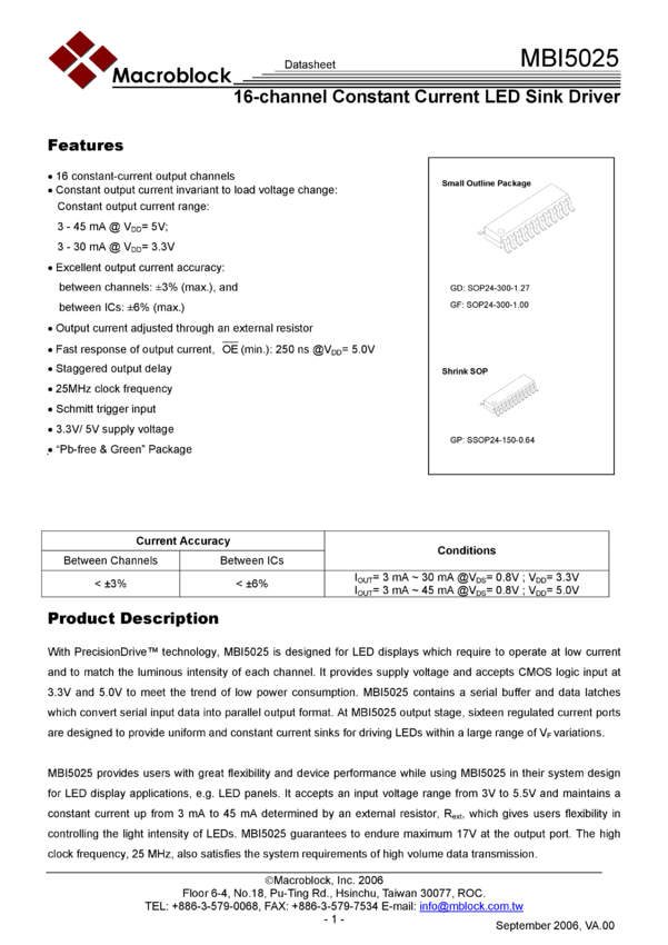 16-kanałowy LED driver, 3-30mA/3.3V, 3-45mA/5V, SOP24-300-1.27