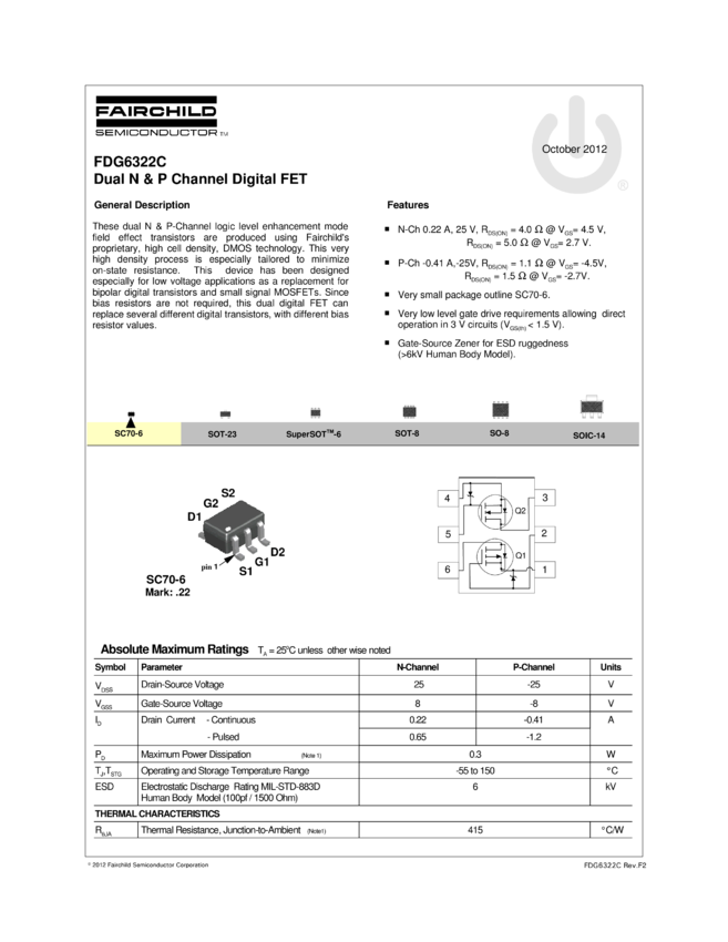 Podwójny MOSFET, kanał N i P, SC70-6, Fairchild