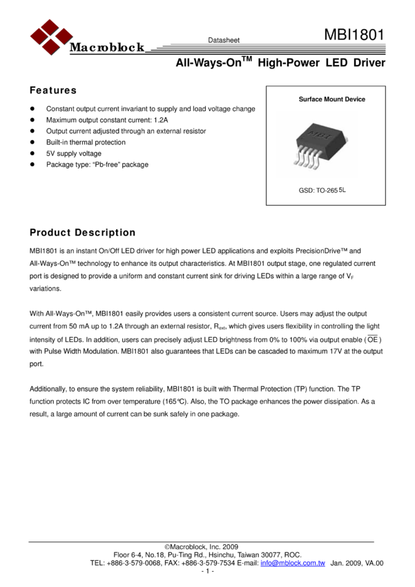 1-kanałowy ON/OFF High-Power LED Driver, 1.2A, 5V, TO-265 5L/800szt.