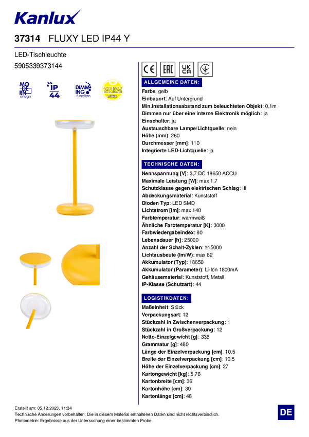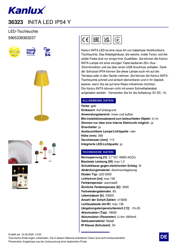 Lampa stołowa LED na baterie Kanlux Inita 36323 LED wbudowany na stałe 1.2 W żółty 165.00 lm