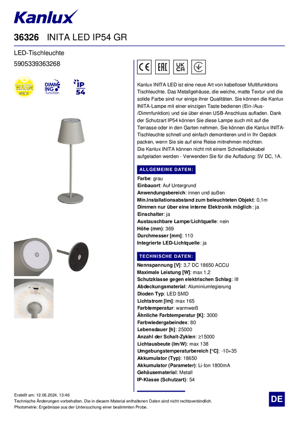 Lampa stołowa LED na baterie Kanlux Inita 36326 LED wbudowany na stałe 1.2 W szary