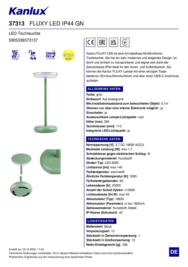 Lampa stołowa LED na baterie Kanlux Fluxy 37313 LED wbudowany na stałe 1.7 W zielony