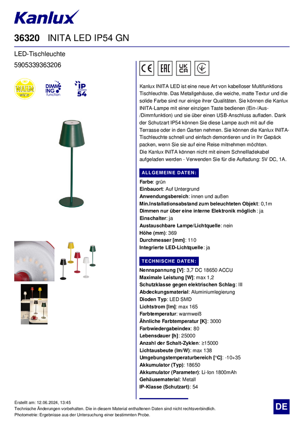 Lampa stołowa LED na baterie Kanlux Inita 36320 LED wbudowany na stałe 1.2 W zielony 165.00 lm